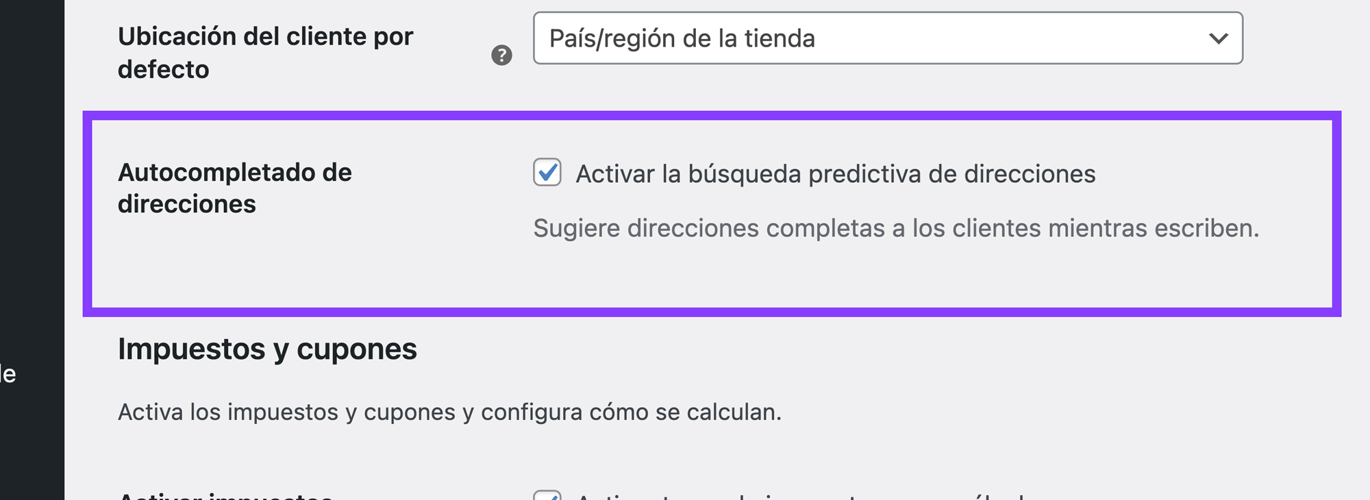 Una vez realizado todo esto, le damos a procesar para poder activarlo. Ahora viene el secreto para tener esta funcionalidad y como te comento en el vídeo anclado a este artículo por si te pierdes en cualquier momento. Debemos ir a WooCommerce > Ajustes > General y marcar la opción «Activar la búsqueda predictiva de direcciones»: